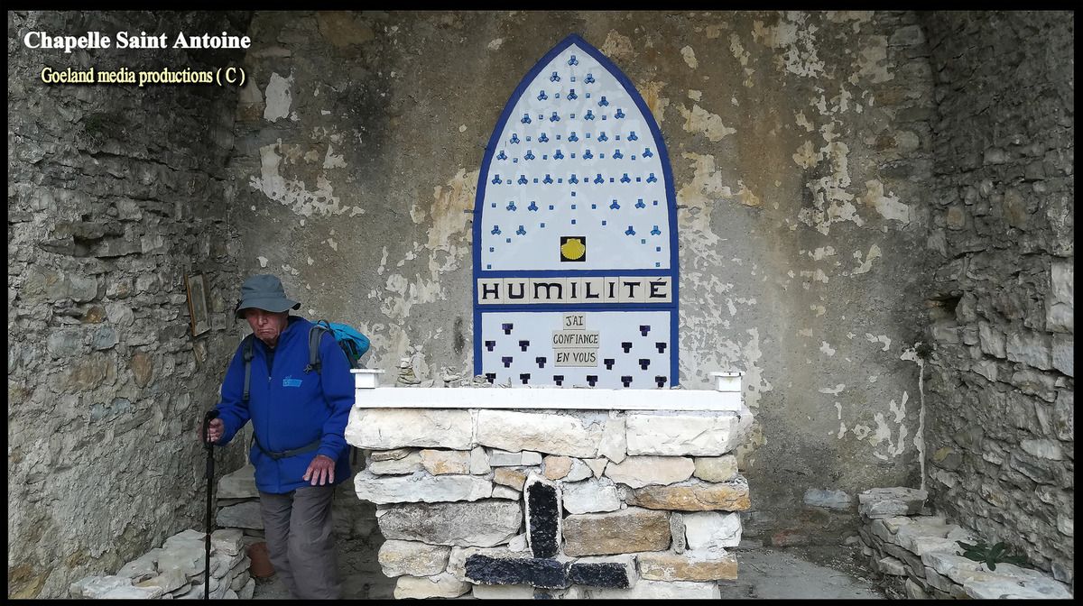 Puis , après une visite à la chapelle Saint Antoine en cours de restauration , on descend vers le village neuf . Deux personnes , fatiguées sont laissées au bar ; les 4 autres filent sur l’ancienne Via Domitien ( restes de pavage visibles ), on passe près d’un très beau pont Romain et auprès du cairn du « nombre d’or « dressé récemment par les « Amis de St Jacques « ; une dure montée et une pénible descente sur le sentier défoncé nous emmené à l’ Église romane Saint Donat .